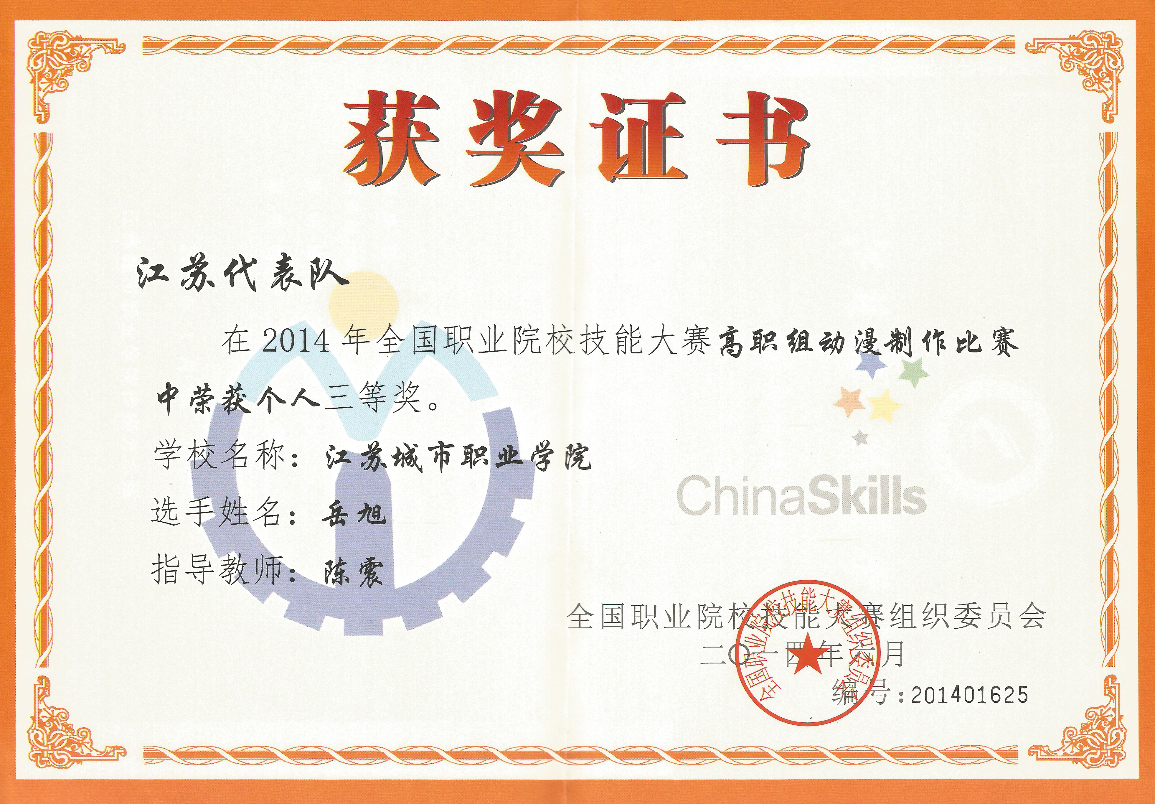 影视动画学生岳旭获得2014年全国职业院校技能大赛三等奖