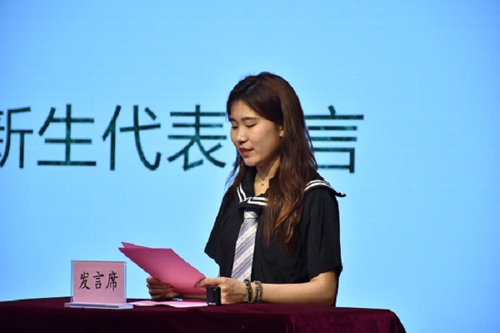 新生代表周洋分享了自己从入校迎新到报道后两天内的大学生生活的点滴和收获,并代表2021级全体新生向关心他们的学院领导、老师、迎新志愿者表达敬意和感谢,最后她号召同学们继续努力,将来在江苏开放大学不断圆自己的本科梦,硕士梦和博士梦。