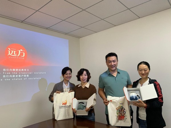 优秀校友、公司法人马柏春首先对设计学院一行表示了欢迎,并带领设计学院一行就公司的雕塑制作车间进行了详细地参观讲解。参观后的会议中,校友马柏春对公司的业务范围、优秀案例、创业思路等进行了精彩的分享,并就专业建设、产学研合作、学生实习等与学院一行进行了探讨交流。“物寄学院情,师生不断联“,会后,党总支部书记邹佳、副院长孙培松为校友马柏春、孙艳赠送了学院自己制作的文创产品,并热情地邀请他们参加11月6日的校友返校日活动,一起见证母校的发展。