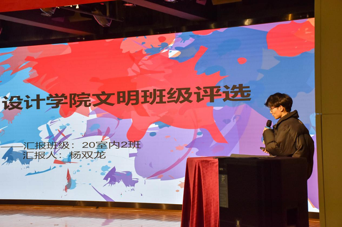 此次评选由基础评价和现场汇报演讲两部分组成。各班级汇总学业、第二课堂等各方面成绩折算成基础评价分值,加上现场汇报分值,共同作为文明班级评比依据。各班代表从班级文化、班级荣誉、班级学风、现场展示等方面汇报了班级建设成果,通过PPT、短视频等形式聚焦学风建设、学习成果、校园文化活动等文明创建情况,充分展现我院班集体的精神面貌和青春活力。经过分数核算,20广制一班、20数媒1班、20室内3班取得此次文明班级评选前三名的成绩。