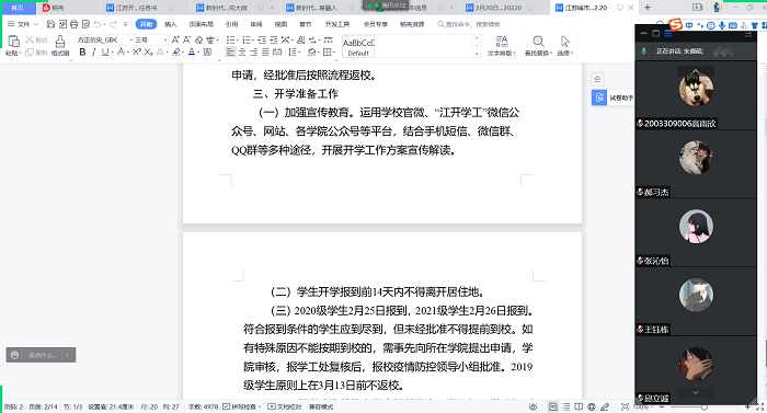 邹佳向全体参会老师传达了《江苏城市职业学院2022年春季学期学生返校工作方案》文件精神,结合校学工处工作要求,从学生开学返校前信息摸排、返校相关要求、返校报到程序、返校后学生管理四个方面提出具体要求。她指出,现在进入了开学准备工作关键期,要进一步强化责任意识,集中精力抓好工作落实,确保学生返校工作平稳有序。
