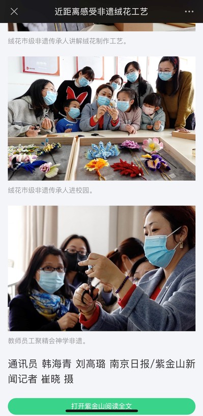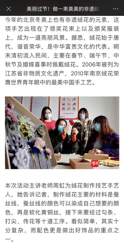 同日,紫金山新闻刊文《近距离感受非遗绒花工艺》,报道如下: