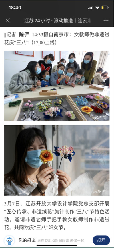 近日,交汇点新闻、视觉江苏、紫牛新闻、紫金山新闻等多家省市级媒体对我院“匠心传承非遗绒花”这一特别的“三八节”活动进行了报道。