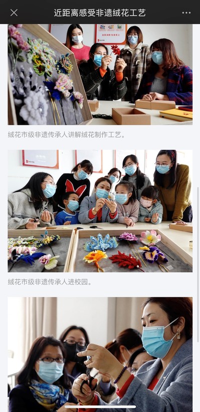 北京冬奥上我们看到非遗绒花,这项手艺出现在了领奖花束上以及颁奖服装上,成为一道亮丽风景,永不凋谢的绒花是中国人特有的浪漫。设计学院女教师们认为要亲力亲为的主动参与到地域文化挖掘和传承创新、推动中华民族文化复兴的使命中去。要让更多的年轻学生热爱本国文化,传承非遗工匠精神,让古老技艺能融入日常文化生活,让中国民俗文化走得更好,传得更远。