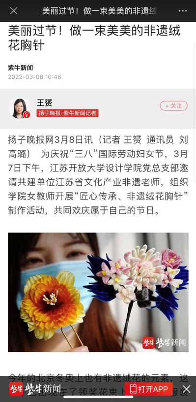 3月8日,紫牛新闻刊文《美丽过节!做一束美美的非遗绒花胸针》。以下为原文和链接: