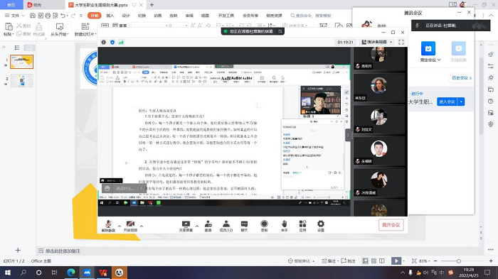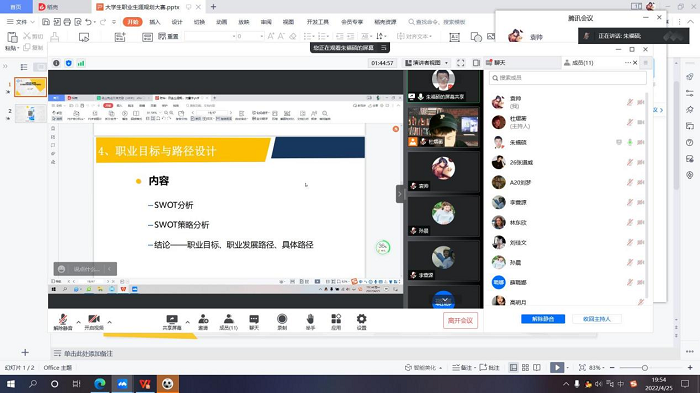为了助力学生备战职规赛,指导学生掌握职业规划方法,设计学院于4月25日晚召开了大学生职业规划大赛赛前辅导线上会议。本次会议采用线上腾讯会议的形式进行,设计学院辅导员朱福硕、孙晨、杜子豪同学(江苏省第十六届大学生职业规划大赛省级一等奖、校级一等奖获得者)和参赛同学共20余人参加。