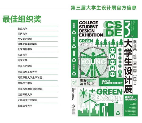 紫金奖·第三届中国(南京)大学生设计展以“美好·与自然共生”为年度关键词,由中央美术学院、清华大学美术学院等九大美院领衔,全国百所知名高校参展,顶级评审专家加盟,汇聚了众多新生代设计力量。参展作品来自于150多所高校,共计28639件。我校精心组织,认真筹备,遴选出44项作品参展,获得最佳展品优秀奖1项,最具人气优秀作品奖1项,设计学院的原创文创设计进入“CSDE大学生设计展x荔枝文创”优秀学生设计作品孵化平台,学校被活动主办方授予“最佳组织奖”,副校长罗逾兰,代表学校接受了江苏省教育厅厅长葛道凯颁发的获奖证书。