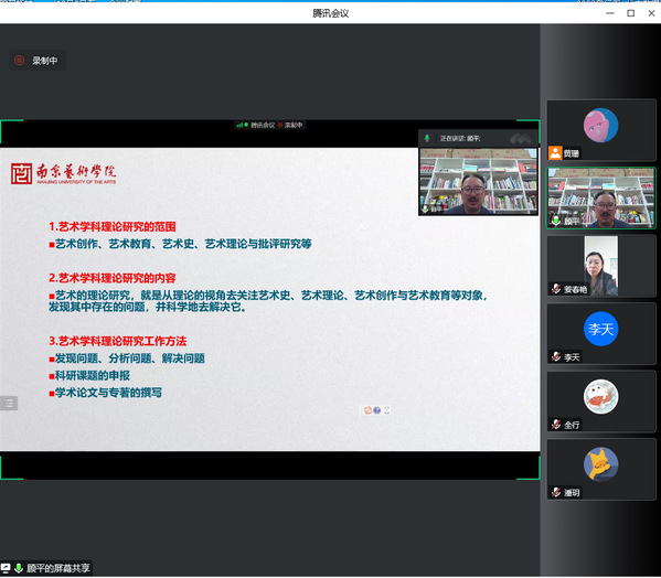 首先,顾教授介绍了今年刚刚发布的学科目录调整情况,建议新进青年博士教师可以继续按照原专业方向的积累去深入研究,从理论视角去关注艺术史、艺术创作与艺术教育等对象,发现其中存在的有价值的问题去申报课题,用科学方法去解决它。同时,对实践性较强的设计类和创作类问题,也建议老师们在设计实践中发现问题,转化到理论研究,从而进一步进行学术研究。
