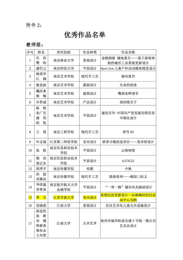 江苏省高校设计作品展每两年举办一届,本届设计作品展共收到全省128所本科与专科高校提交的5300余件作品。经过专家遴选,评出优秀作品210件,其中教师组47件,室内设计专业方向优秀奖6项。获奖作品将在江苏省美术馆等多个高校进行巡回展出。