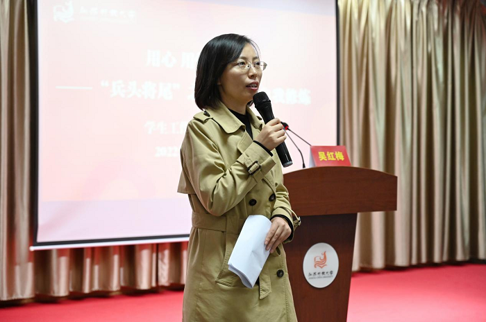 首先,吴红梅以“用心 用情 用脑”为主线指导宿舍长们如何担当好责任,并在工作中完成自我修炼。她从“为什么需要宿舍长”、“宿舍长要做什么”、“怎么做好宿舍长”三个问题出发,让宿舍长首先充分认识到自身的价值和职责,然后结合学校关于宿舍长管理规定、宿舍标准化建设以及身边的实际案例,让大家进一步理解宿舍管理要求,并做到对宿舍的每一项管理要求心中有数。她希望各位宿舍长提高自己的责任意识,用真诚、包容、自律的心,增进宿舍成员之间的沟通,做好老师和同学之间的桥梁纽带,积极发挥宿舍长领航员、协调员、信息员的作用。