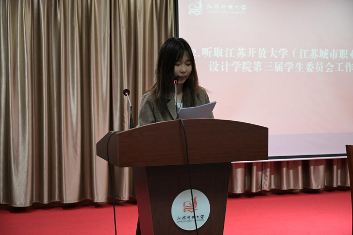 接着,设计学院第三届主席团成员包珍妮在会上宣读《设计学院第三届学生委员会工作报告》,回顾过去一年工作成绩与其中的不足,希望新一届学生会继续发扬团结奉献创新的精神,切实服务好学院青年的成长成才。