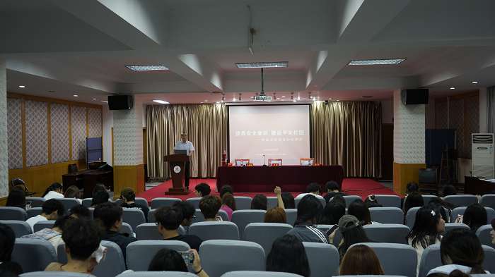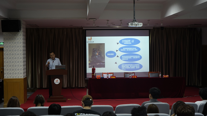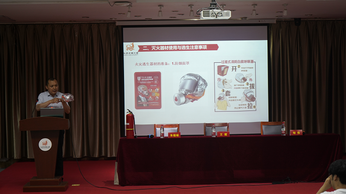 首先,由王建老师作题为“提高安全意识 建设平安校园”消防安全知识讲座。王老师结合近期高校校园、社会火灾的典型案例,通过图片和视频讲解火灾发生的主要原因、种类、防范措施、应急处置等。重点阐述对违规电器、充电宝、插座等超负荷电器火灾的预防及安全隐患自查方法,火灾扑救方法及详细的应急逃生策略,并对常用消防用具,消防器材的使用方法等进行了现场演示。