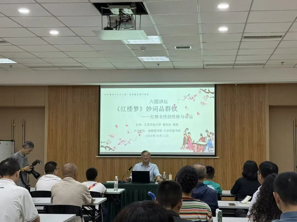 10月12日,我校设计学院院长谢冬冰教授应邀前往南京六合区图书馆,开展《红楼梦》“妙词品群钗” 主题讲座。此次活动由南京六合区图书馆和金陵图书馆联合举办,是学院深化校馆合作、发挥社会教育功能的重要实践,不仅展现了我校教师深厚的学术素养,更将优质教育资源延伸至社会公共文化领域,获得现场读者高度认可。