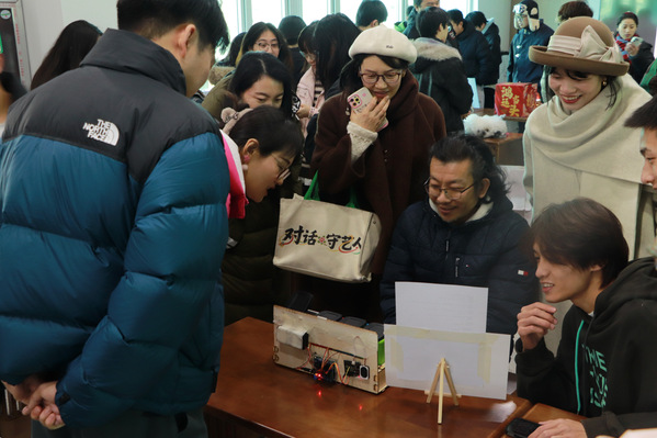 展览现场,从灵动的光影感应到复杂的机械联动,一件件构思精巧、形态各异的互动装置吸引了众多师生驻足体验。谢冬冰、孟刚和蒋丽丽对同学们的作品给予了高度评价,肯定了课程教学改革的成效。特别值得一提的是,学生在项目实践中熟练运用AI工具辅助设计与开发,不仅提升了创作效率,更体现了学院在“数智化创新”人才培养方面的显著成效。参观的老师们指出,同学们在作品中展现出的专业素养、挑战精神以及持续不懈的钻研劲头令人惊喜。