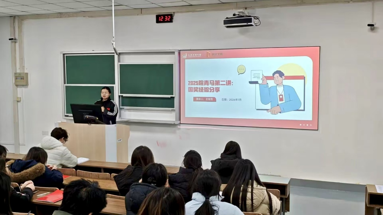 为深化青马工程育人实效,发挥榜样示范引领作用,2026年1月6日,设计学院青马工程培训班举办经验分享会第二讲。国家奖学金获得者王瑞雪、“挑战杯”校赛一等奖获奖团队代表刘晓娟应邀登台,为青马学员带来了一场兼具理论深度与实践价值的思想盛宴。本次培训由学院团总支书记陆静主持。
