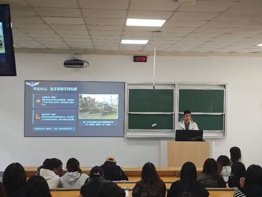 培训课上,刘钱龙同学以老学长的身份,用朴实而鲜活的讲述,为学员们展开一幅真实的军旅画卷。他从参军初心的多元追问切入,坦言自己也曾是“热血电竞真人版玩家”,满脑子装甲部队的钢铁洪流,却在真实军营的淬炼中完成了从虚拟战场到现实担当的蜕变。他回忆起新兵连时,十一月的海风如同“AP伤害”般刺骨,重感冒裹紧大衣却被班长呵斥——“我看到的不是‘他好冷’,而是‘这支队伍缺了股气’”,这番训斥让他明白,部队要的不是温室花朵,而是寒风中也站成松的韧劲。他讲述所在部队的光荣传承:抗美援朝时,平均飞行仅十几个小时的先辈,以“空中拼刺刀”的血性迎战美军王牌,打出赫赫威名;2015年军改后,所在部队成为全军首家整建制换装歼-16的探路者,2019年国庆阅兵中,成为唯一一支空中战机编队与地面战旗方队同时受阅的部队。他动情地说:“有些荣耀,不是看见了才算数,是成为它的一部分之后,才真正看懂。”